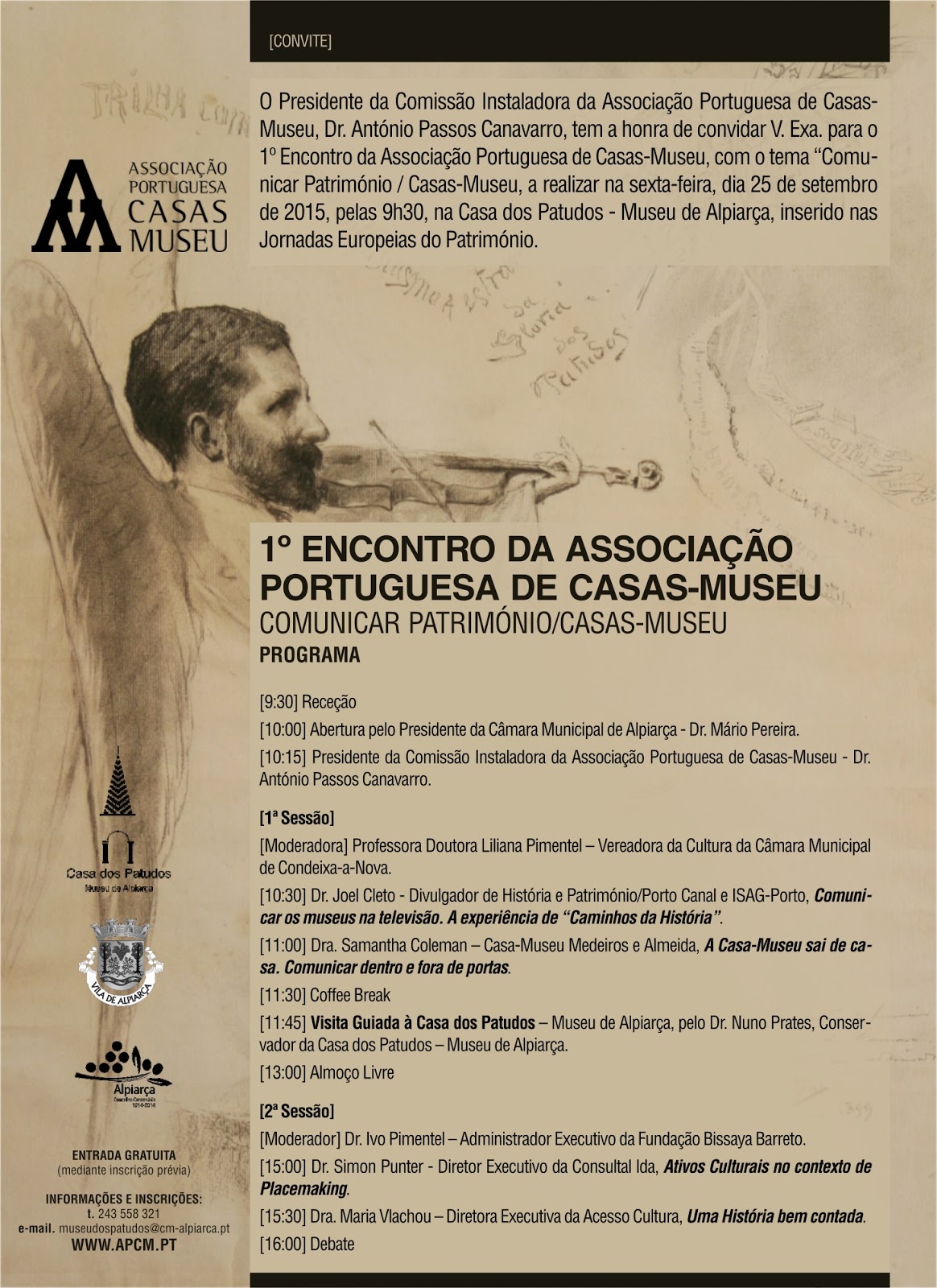 Realiza-se no próximo dia 25 de Setembro de 2015, na Casa dos Patudos - Museu de Alpiarça o 1º Encontro da Associação Portuguesa de Casas-Museu, dedicado à temática Comunicar Património/Casas-Museu.